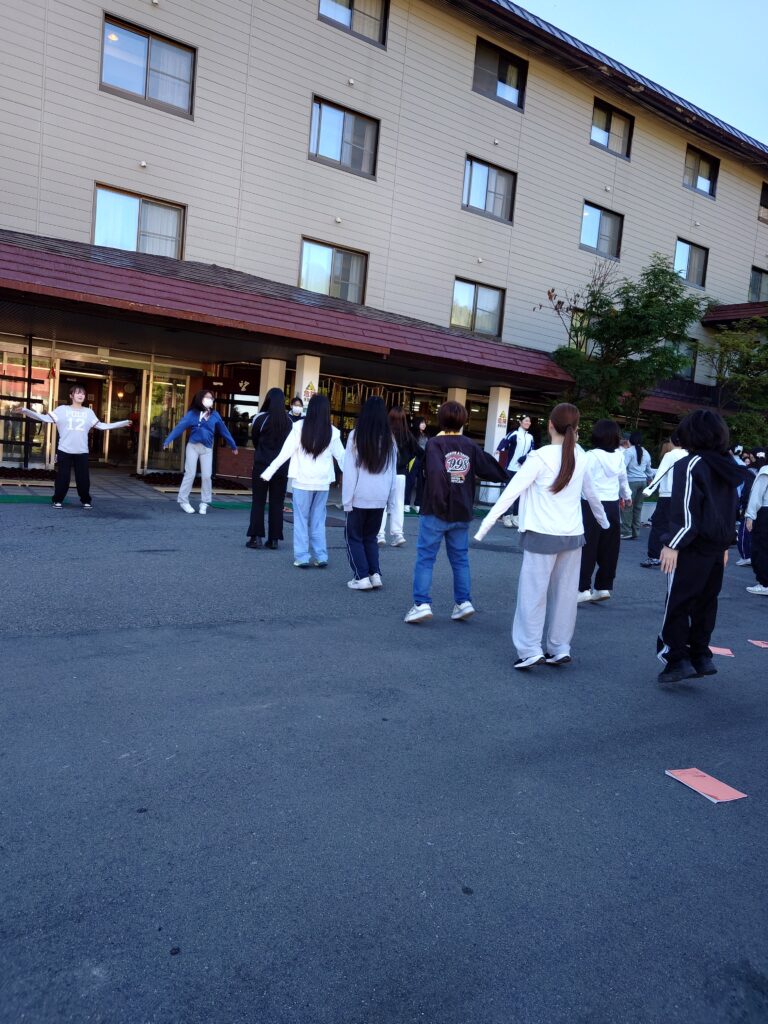 お隣の熊ノ湯ホテルに泊まっている他学科の学生と一緒に、歌を歌ったり、フォークダンスを楽しんだりして、思い出に残るひとときを過ごすことが出来ました。