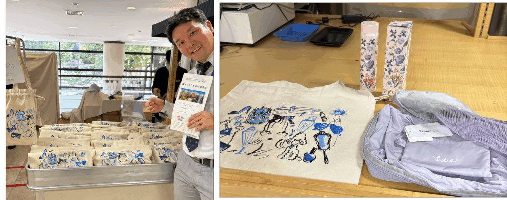 左から、大橋美由紀さんイラストのトートバッグ、FranFranコラボのボトルとポーチです。かわいいですねえ。