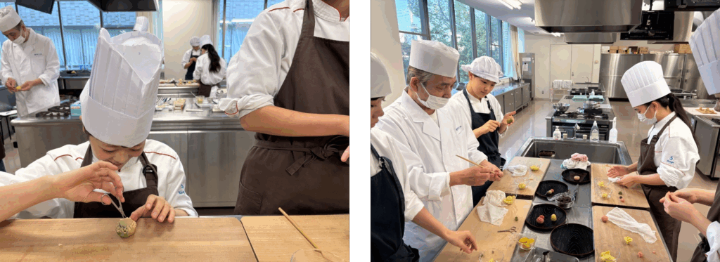 小さなハサミを使って切り込みを入れ、菊の花を作ったり、箸を使って立体感を出したりと、学生も真剣に取り組んでいます!