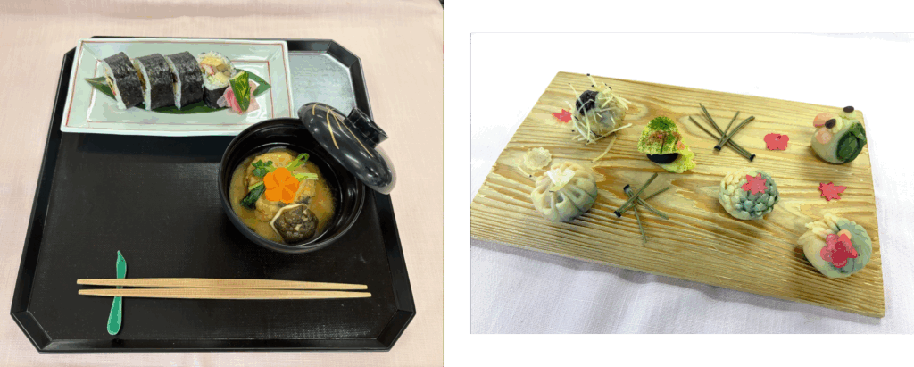 こちらが先生の作られた太巻き寿司(左側)と和菓子(右側)のお料理です。