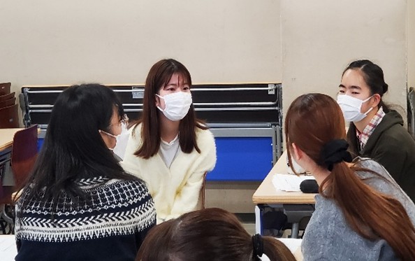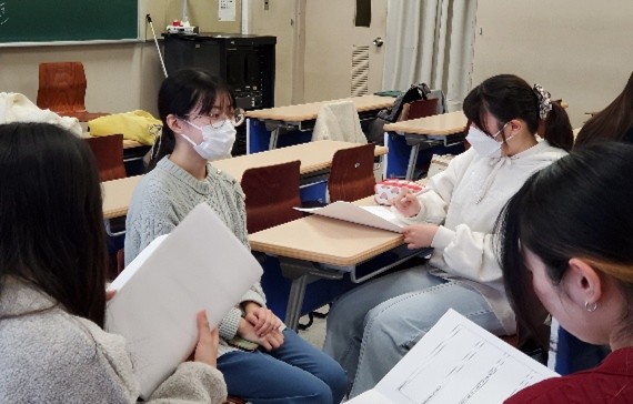 フードマネジメントコースの学生は製菓会社に、図書館司書・ITコースの学生は衣料品の販売会社に、国際観光・ホテルコースの学生は人材サービス会社に、ファッション・造形デザインコースの学生はアパレルの会社に内定をしています。