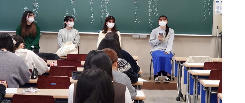 このセミナーは総合文化学科が独自で行うもので、講師にはすでに内定をいただいている2年生4名が担当しました。各コースから代表者です。