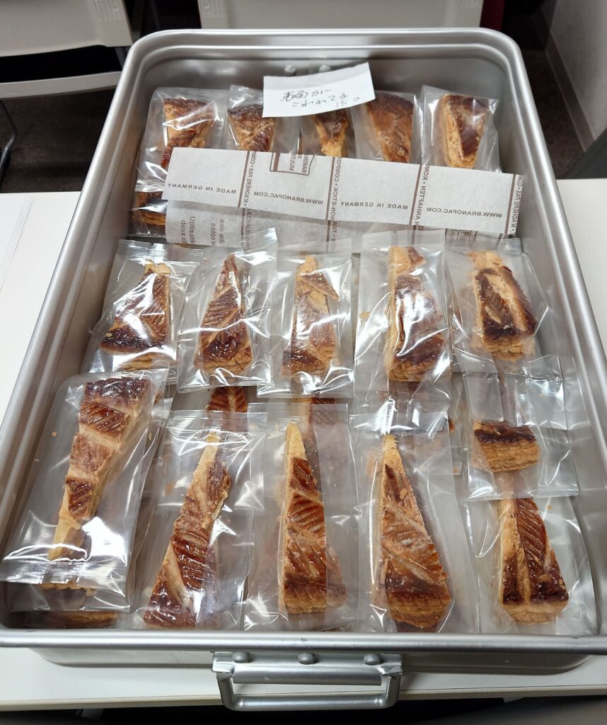 教室の入口には、美味しそうな焼き菓子が!!そう、この日の堀田先生の講義には、なんと、堀田先生がご自身で焼いてくださった、ガレット・デ・ロワのお土産付だったのです♡