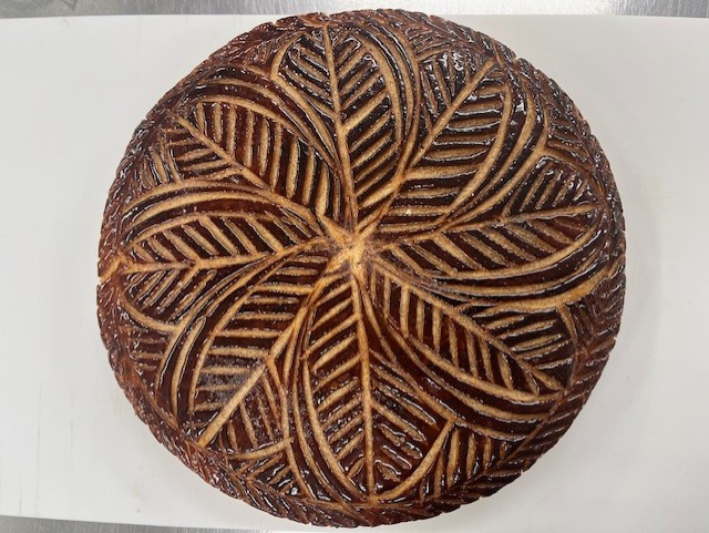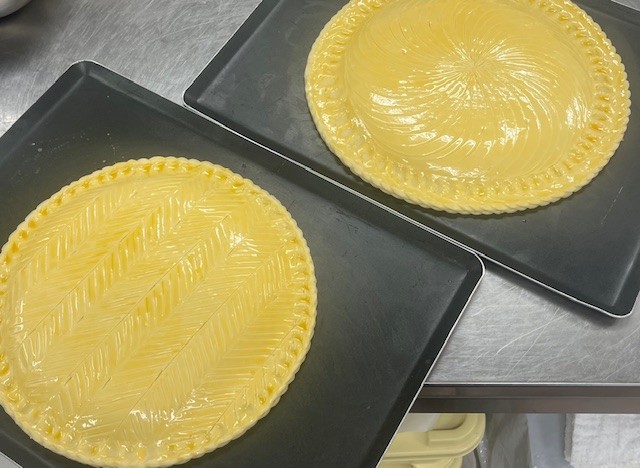 中にフェーヴ(小さな陶器の人形)を入れて王様を決める楽しみ方は、前回のブログで紹介されました。この表面の模様にはいろいろなパターンがあって、焼く前のパイ生地に包丁で切れ目(レイエ) を入れて作ります。