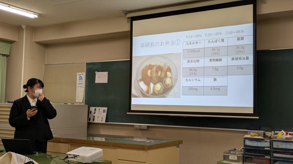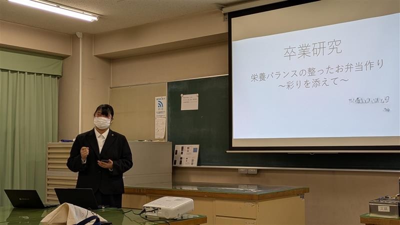 卒業研究のために昨年の7月から自身の作ったお弁当を撮影し、栄養バランスの整う且つ彩りの良いお弁当作りを研究した。