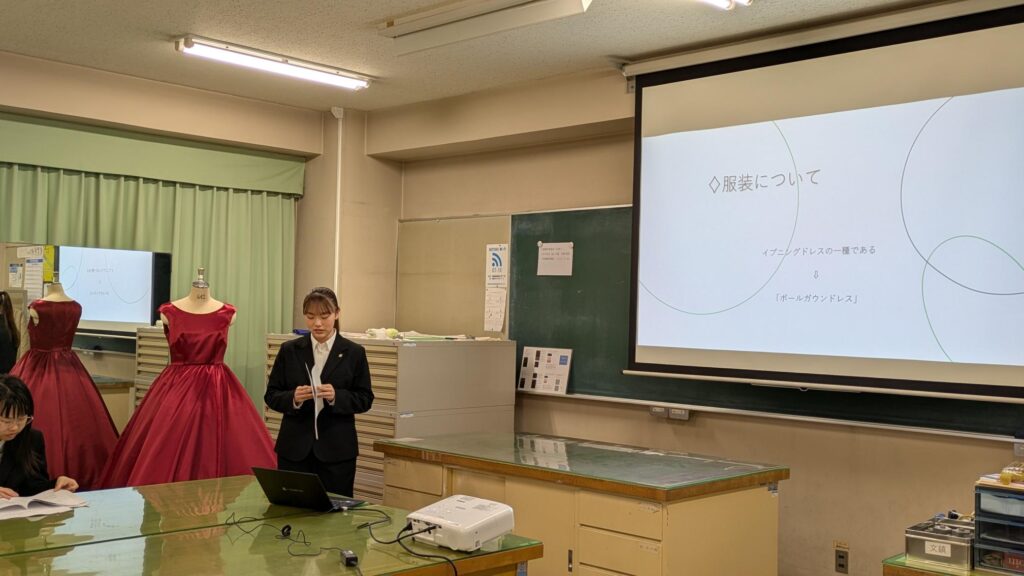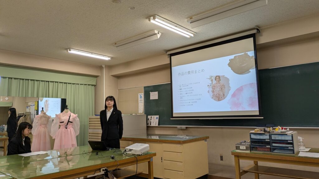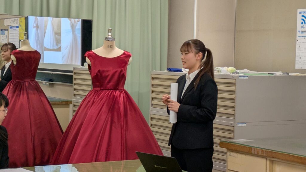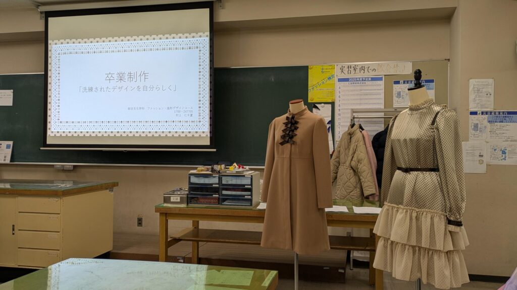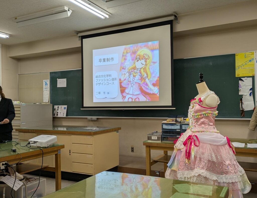 第1弾は昨年の12月20日に行っています。その時の様子もブログで紹介していますのでご覧くださいね。今回はフードマネジメントコース1名、ファッション・造形デザインコース4名の発表です。
