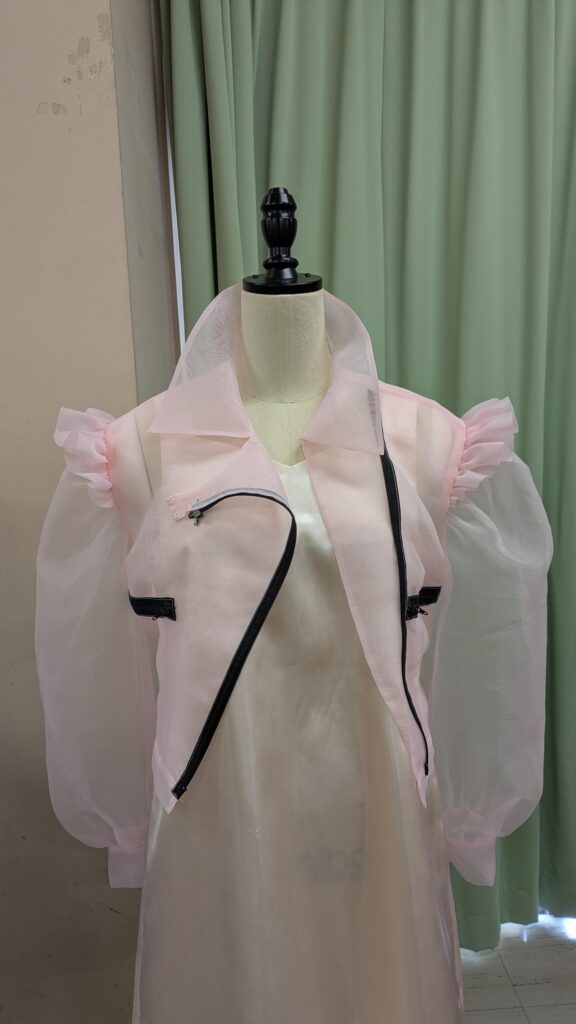 「オーガンジー」を研究テーマにしワンピース、ギャザーサーキュラースカート、ブルゾン風ジャケットを制作