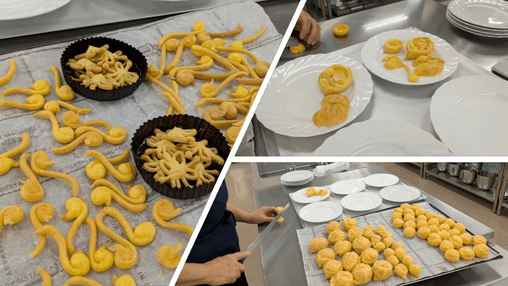 時間の関係上、シュー生地はこちらで用意してホイップを絞り入れるだけにしましたが、授業ではもちろんシュー生地を作って焼いて冷まして…という工程を行いますよ!