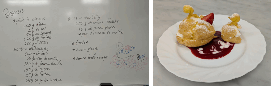 そしてお皿のラズベリーソースにホイップで模様を描き、白鳥の形のシューを盛り付けました!