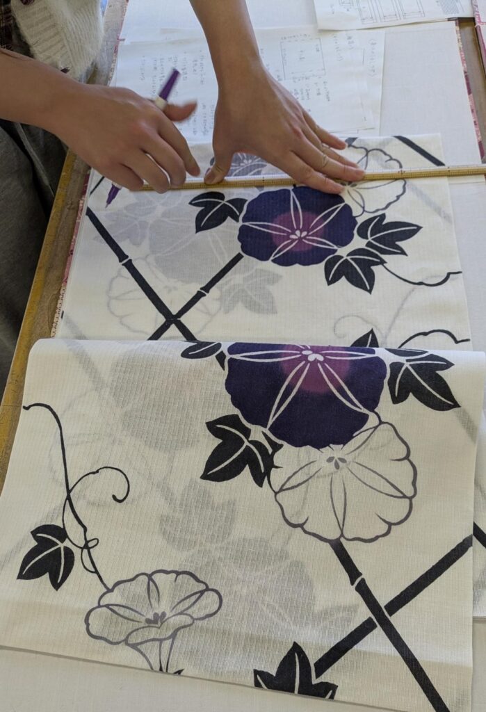 仕立てた時に柄が均等に配置されるように、また上前や背中など目立つところに柄が上手く来るように考えながら作業をします。