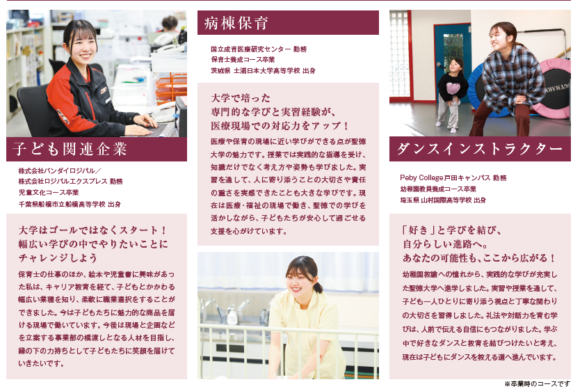 聖徳大学教育学部児童学科では幼稚園教諭・保育士、それに特別支援学校教諭※または小学校教諭※の3つの取得を目指せます!リアタイの体験型学習で楽しみながら実践力を養い、「人の心に寄り添う」幼児教育者・保育者を目指します。また、関東女子大初の「医療保育コース」も大人気!社会のニーズに応える新しい学びも始まっています!