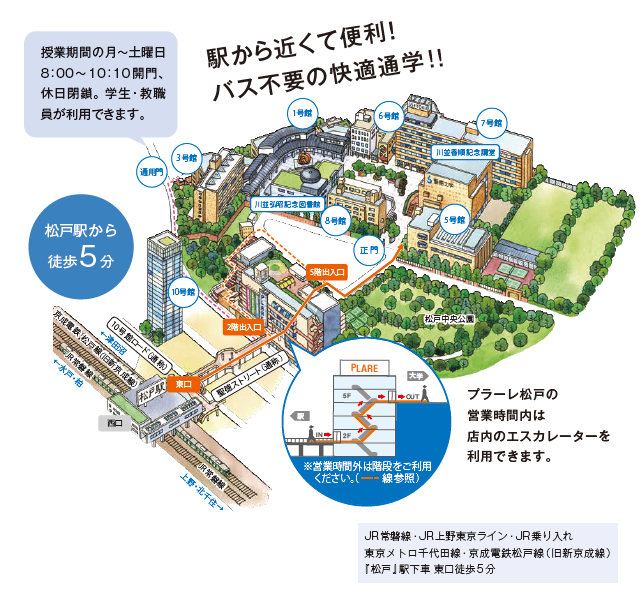 松戸駅から聖徳大学のキャンパスまでは徒歩5分です。また、松戸駅は多方面からのアクセスが抜群です。通学時間を考慮することは、4年間の大学生活を充実させるためには大切なこと!バスの待ち時間や移動時間がないので、その時間を有効に活用することができるのです。