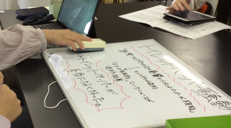 こちらは以前、児童心理コースの Instagram で紹介した「だまされるな」という授業のひとコマで、大学1年生が班ごとに有名な「デマ」を調べた時の写真です。