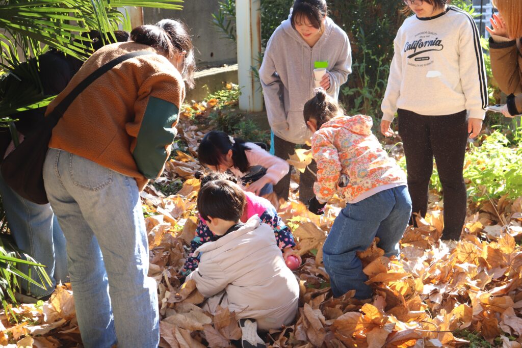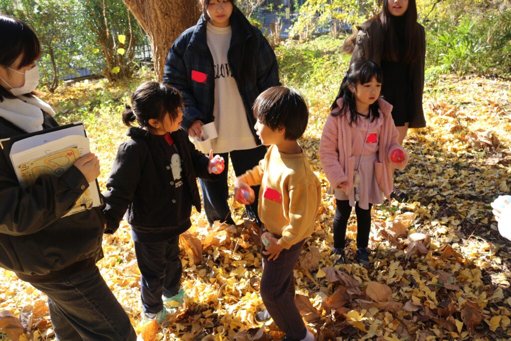 森では「松ぼっくりでけん玉」をしたり、「カプセルに入った、イラスト入りどんぐり探し」をしたり