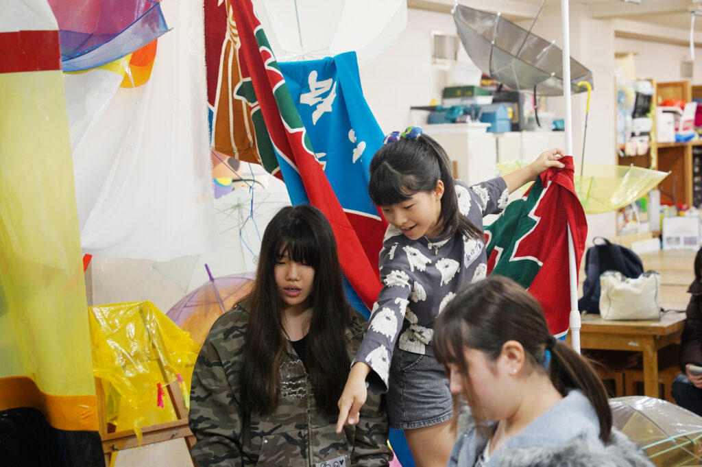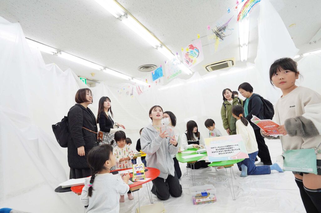 実は「あそびのひみつきち」、2024年に行っており、松戸駅前の良文堂書店で実施しました。(↑写真はその時の様子)不織布などを使って白い空間を作り、透明シートにお絵描きをするコーナーやけん玉、皿まわしなどの伝承遊び体験、学生のおすすめ絵本を展示したコーナー前では読み聞かせを行いました。