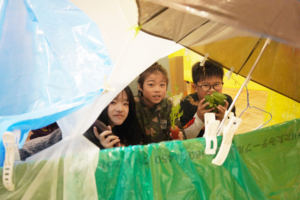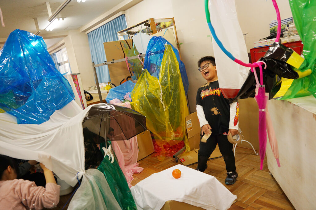 まずは造形班の紹介です。図工室で様々な素材を使って「ひみつきち」を作りました。ワークショップタイトルは「つくってあそぼう!ぼくらのひみつきち」。学生だけで作った時より、はるかに大きなものが出来上がり、改めて子どもの表現力に驚かされました。