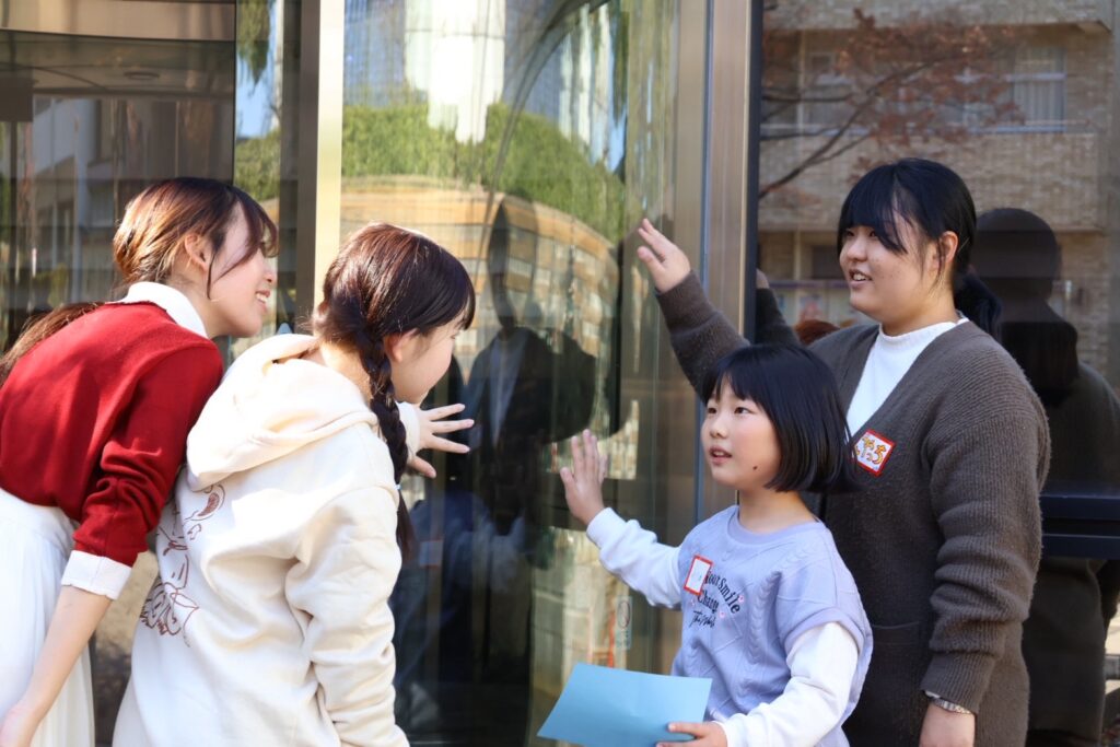準備期間を経ていよいよ当日。子どもたちが聖徳大学に集まってきました。朝の集合のちょっとした時間も子どもたちが緊張しないよう、4年生と1年生が協力して場を作りました。