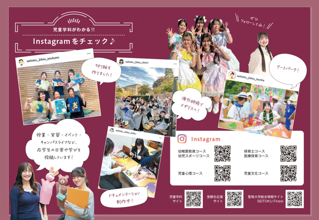 児童学科には4つのInstagramがあります。授業や実習、イベント、キャンパスライフなど在学生の日常や学びを投稿しています!気軽にフォローお願いします!