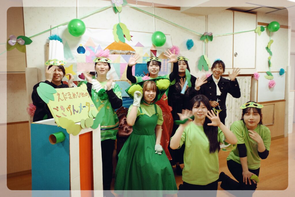 そこに待ち構えていたのは、えだまめ王国のお姫様でした。えだまめ王国のご挨拶「ま〜めま〜め」を受けます。えだまめグラスを付けている子どもたちを見て、ひめさまのごきげんメーターも急上昇!!