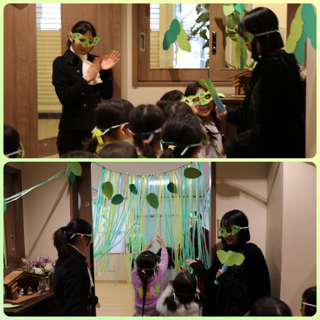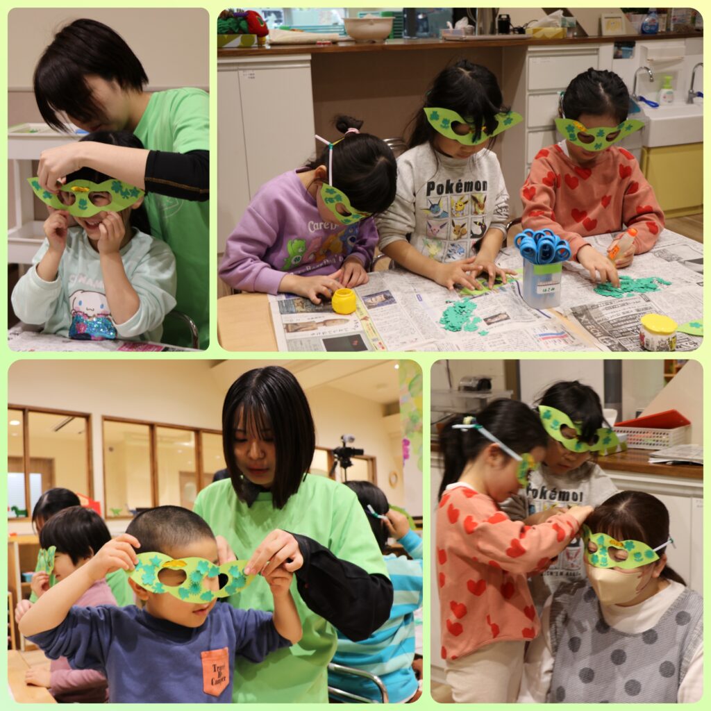 子どもたちには事前に、えだまめ王国のダンスパーティーへの招待状が届いておりました。王国の使者より、ダンスパーティーには、えだまめグラスを付けないと出席することができません。まるでヴェネツィアの謝肉祭での仮面舞踏会のようですね!