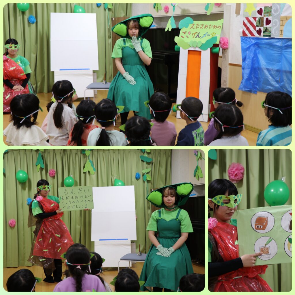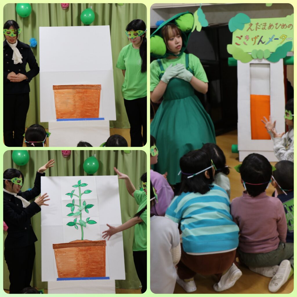 楽しくクイズをしながら、えだまめの成長を学ぶ子どもたち。実はこのパネルシアターの仕掛けの中にも、ちゃんとYouTube動画撮影のワンシーンが入っております。当日は一発撮りでしたが、バッチリうまくいきました!ぜひ動画を確認してみてください。