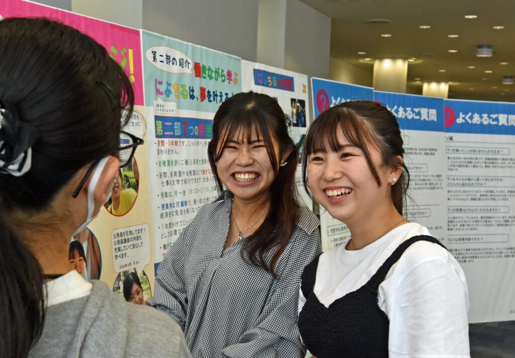 ホイクカの授業内容、キャンパスライフ、入試に関する情報などのパネル展示を行っています。知りたいことは、パネルに沿って説明させていただきます。授業で作成した学生作品なども展示しています。是非ご覧ください!
