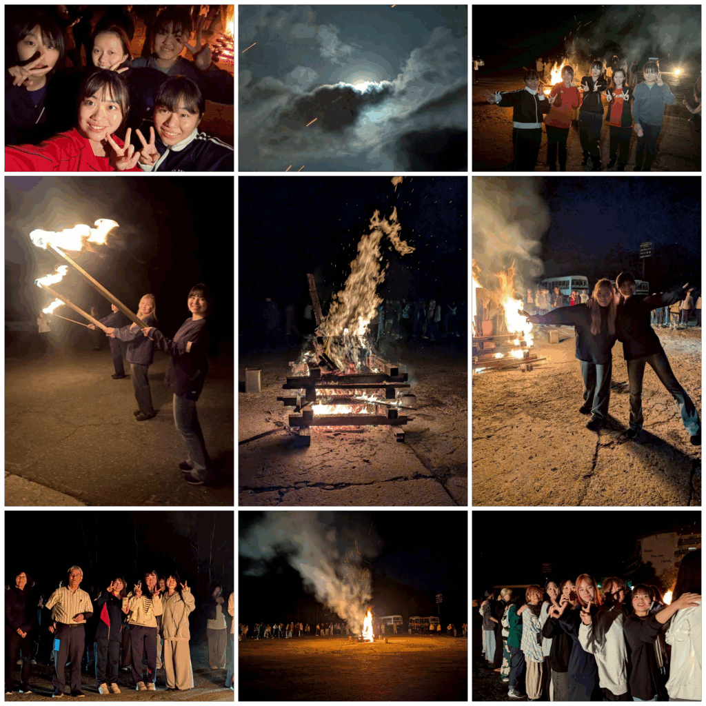 燃え盛る炎を囲み、歌って踊って・・・「ファイヤーッ!」(盛り上がるホイクカ女子😆)