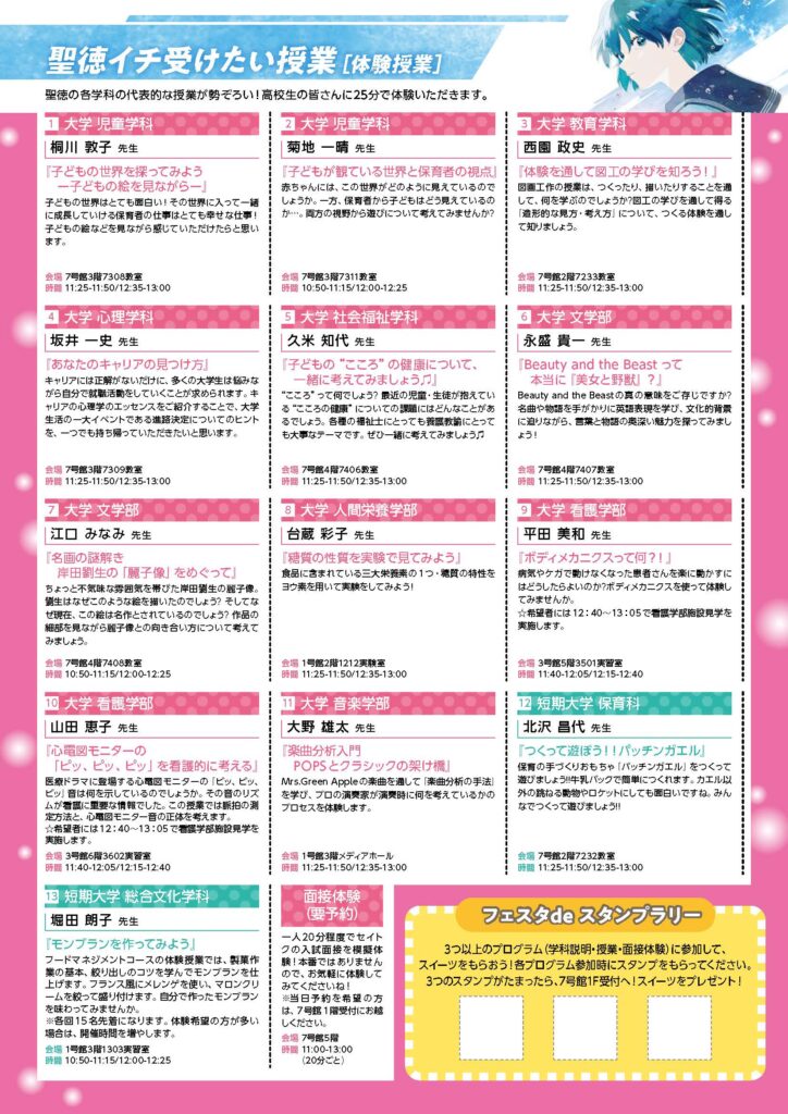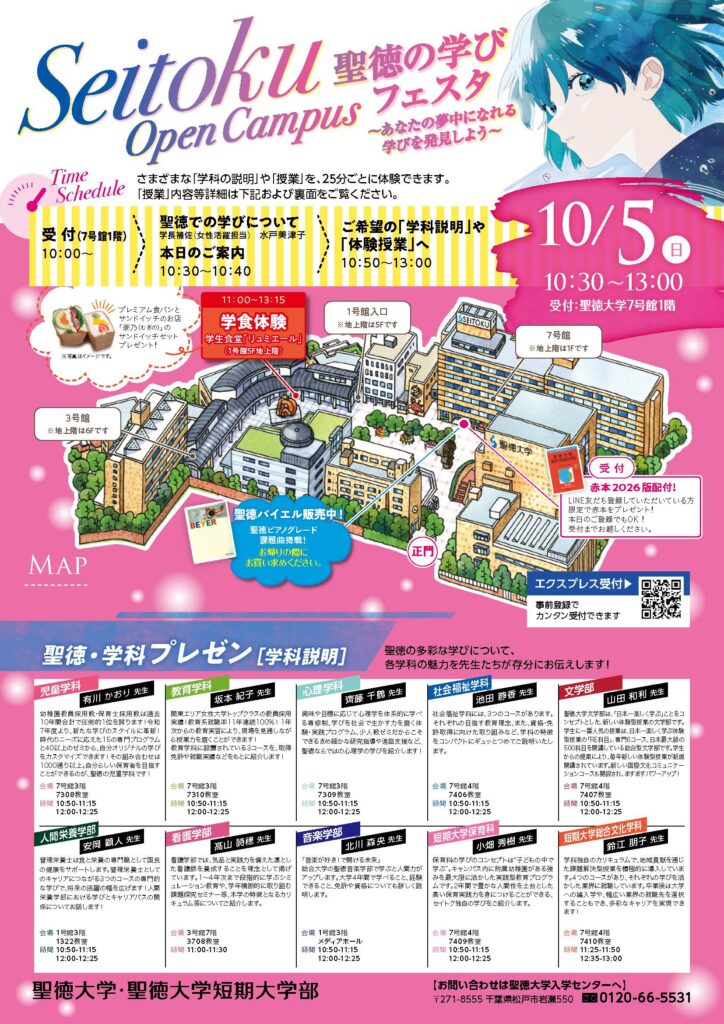10月5日(日)10:30~13:00は、聖徳学びのフェスタを開催します!全学科が学科プレゼンと、楽しい体験授業を準備しています。プログラムを見て、興味のある体験授業に参加してみませんか!!