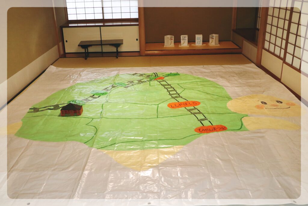 「ひろがれ!こどものまち~かめの地図と、梨の木のしたで!」というタイトルで、松戸市の形をかめに見立てた大きな地図の上に、子どもたちが自分で描いた家を置いて、オリジナルの街をつくりました。