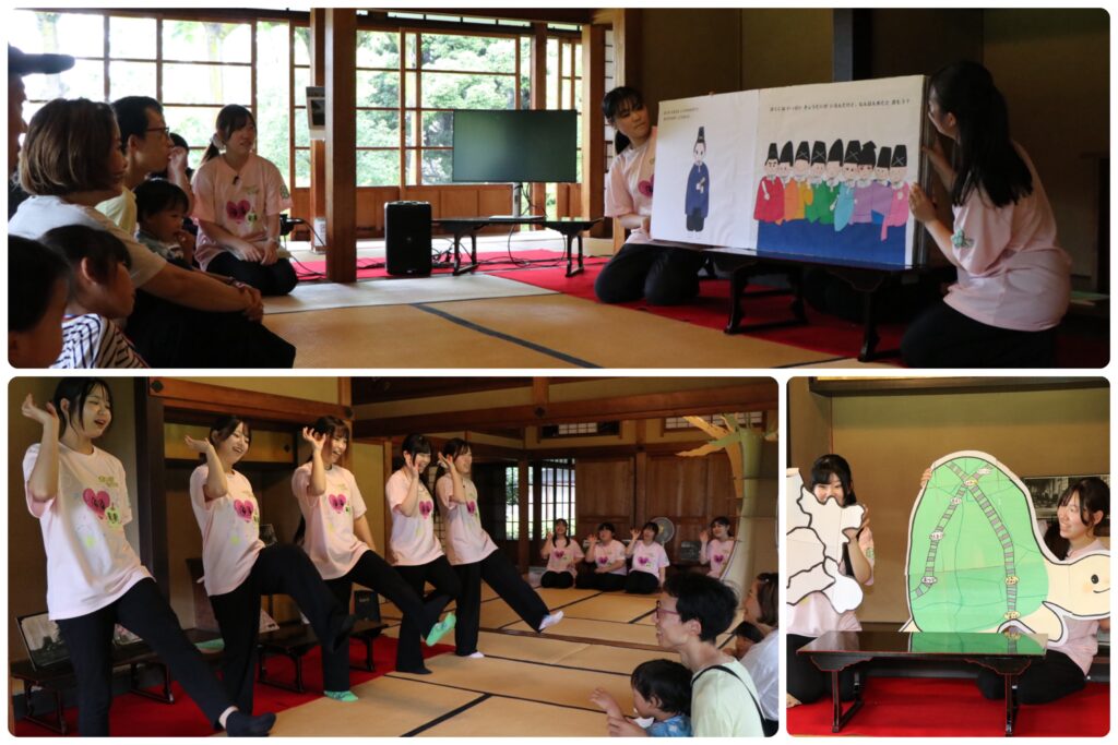子どもたちはまずは戸定邸の広間で、家主とくがわあきたけさんについて知っていきます。戸定歴史館とまつどソング研究グループが共同で作った絵本を読んだり、手あそびで楽しくあきたけさんに親しみを持っていきました。