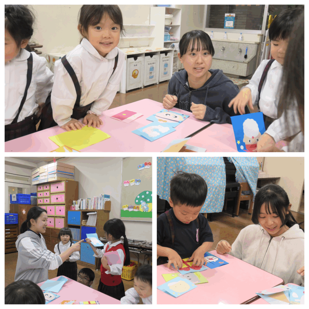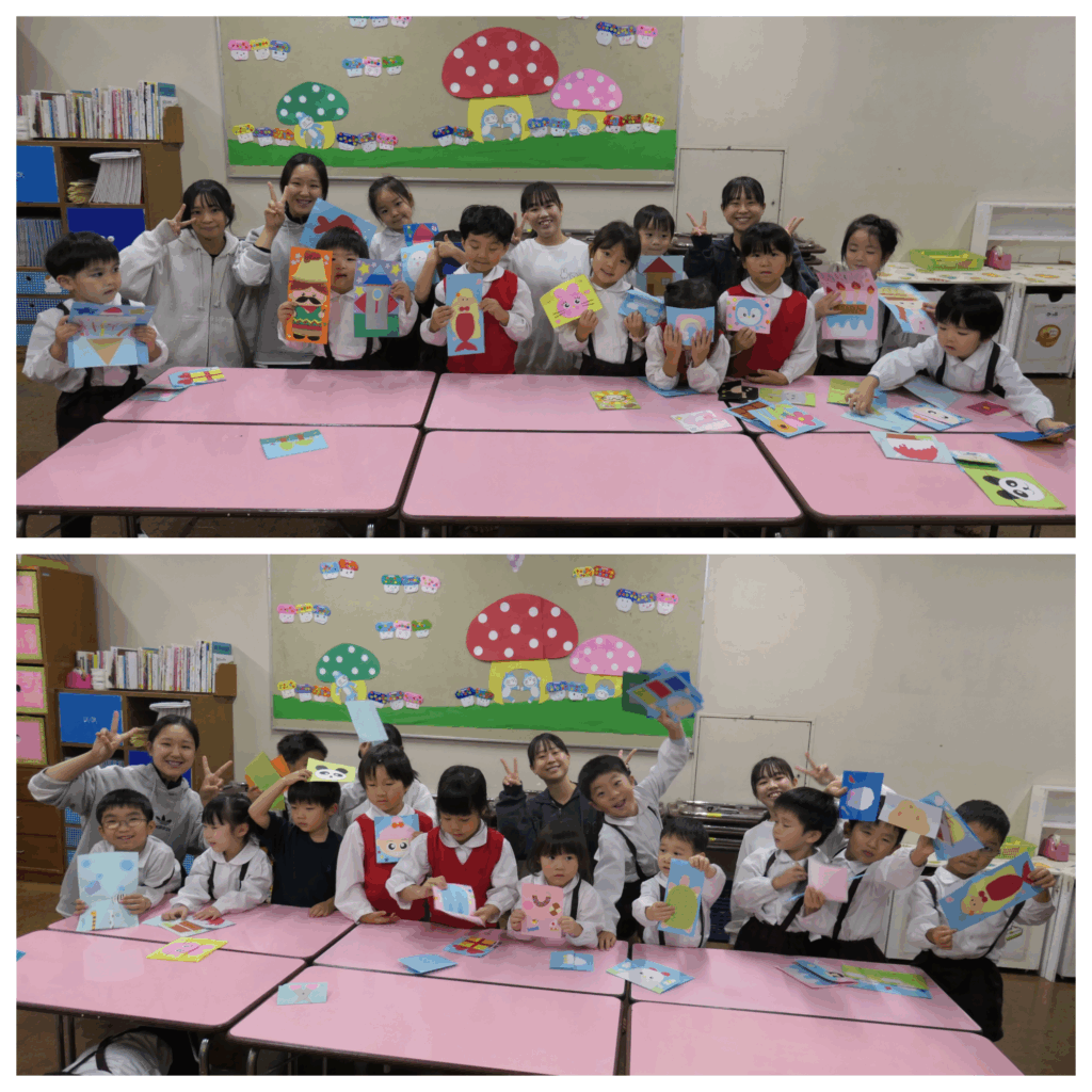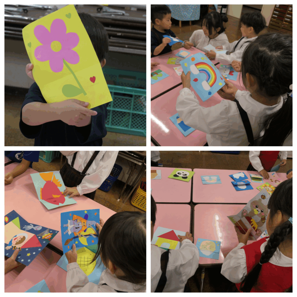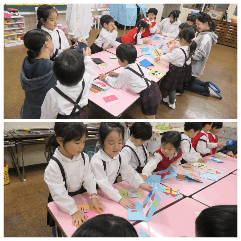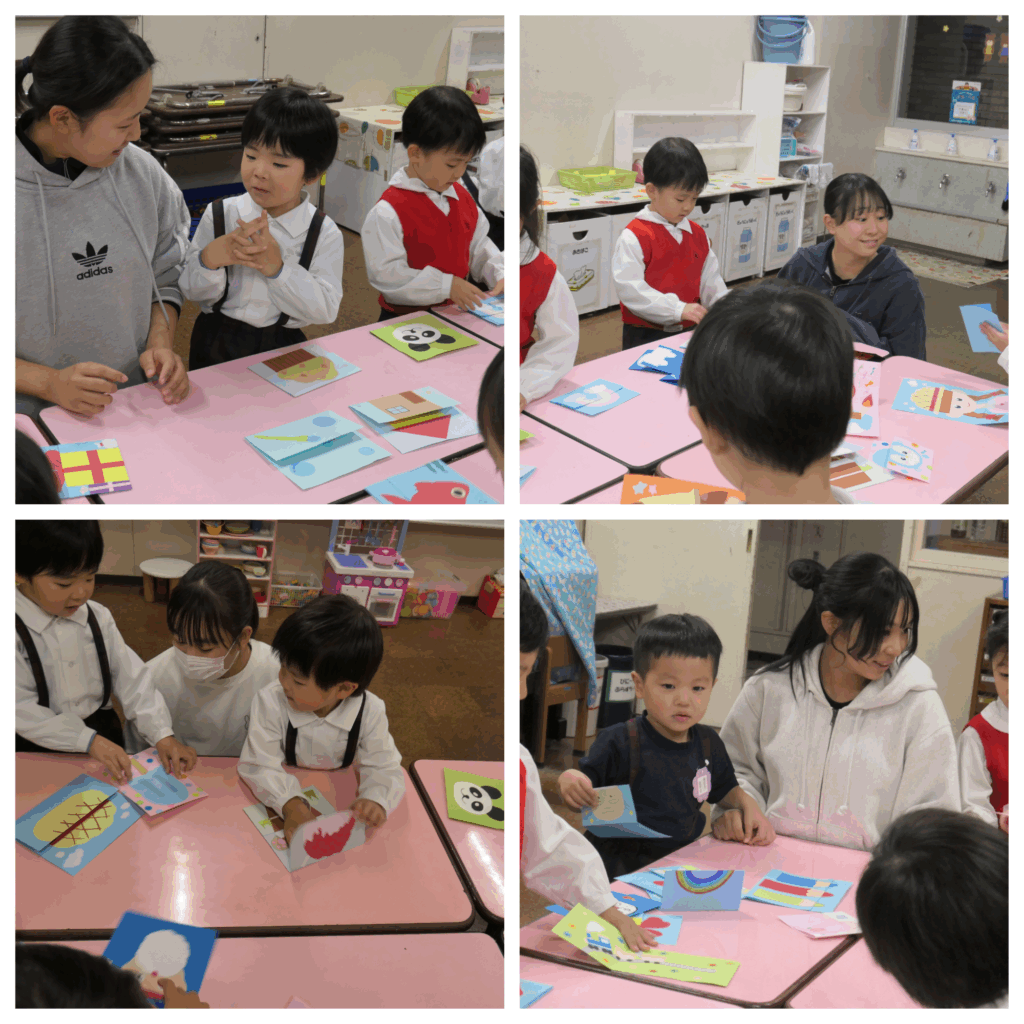 自分がつくったカードやクラスの友人がつくったカードを面白い!!と言ってくれる子どもの姿に触れて、素直に私たちもうれしく思いました。「頑張ってつくって良かった!!」また、つくって持ってきたいなと思いました。