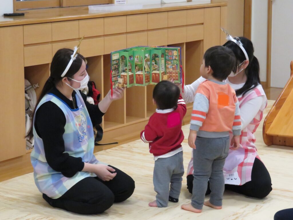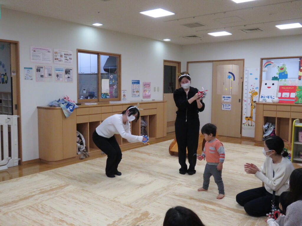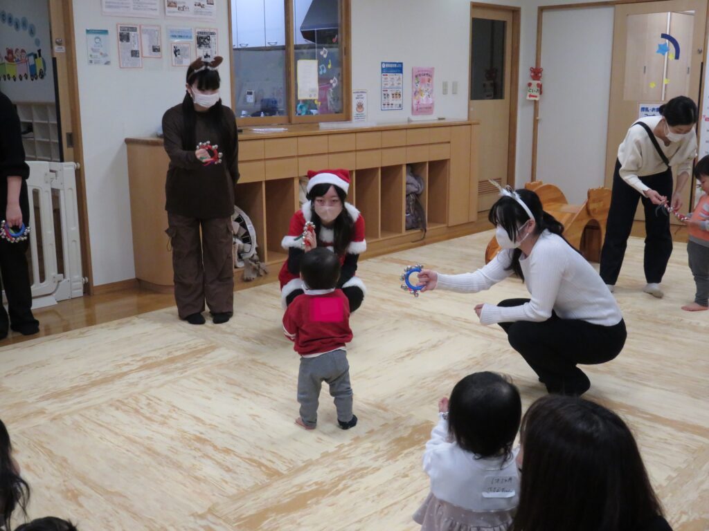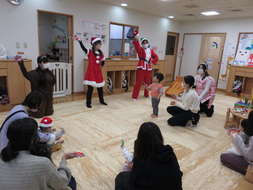 今回は、クリスマス会を行いました。手遊びから始まり絵本やダンスなどを一緒に見たり踊ったりしました。仕掛け絵本の立体感や登場するものに興味津々で不思議そうに見ています。また、ホイクカ女子の明るい歌声や笑顔で踊る姿に、子どももお母さんんも一足早いクリスマス気分を楽しんでいました。