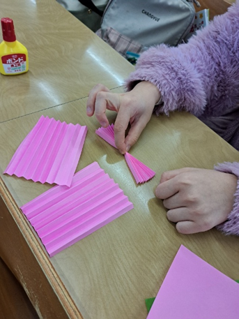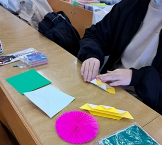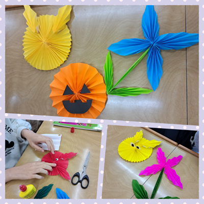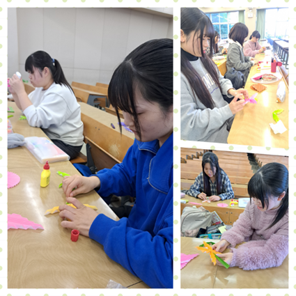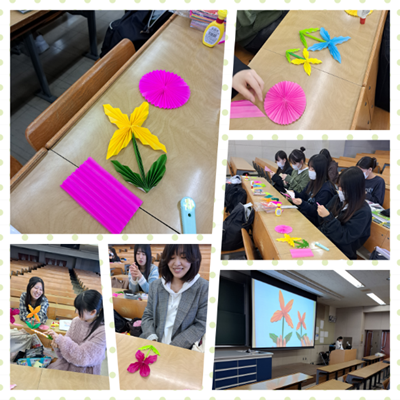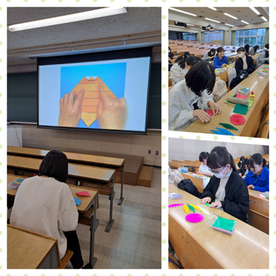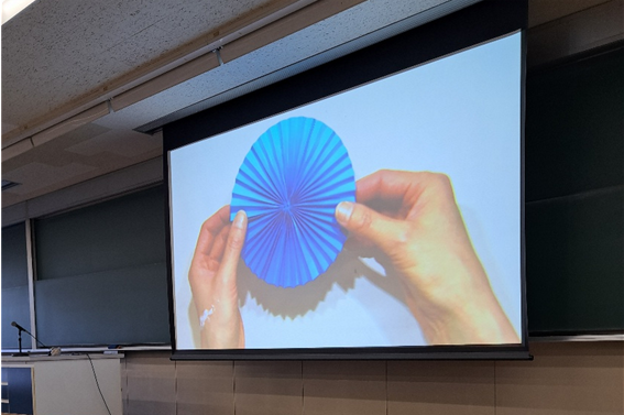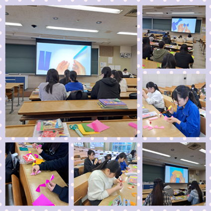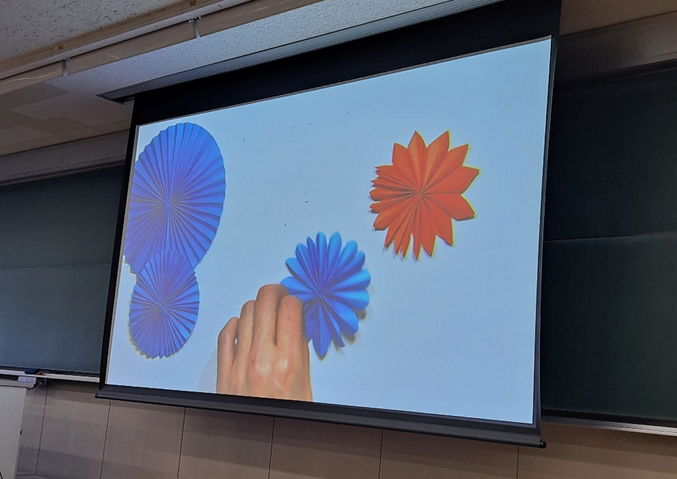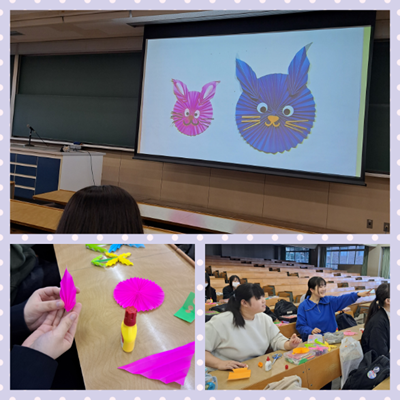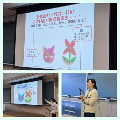 皆さんこんにちは!今回は児童文化(折り紙)の授業をご紹介します。「折り紙を工夫して使う」をテーマに、「ひだ折り」の技法をマスターしていきます。