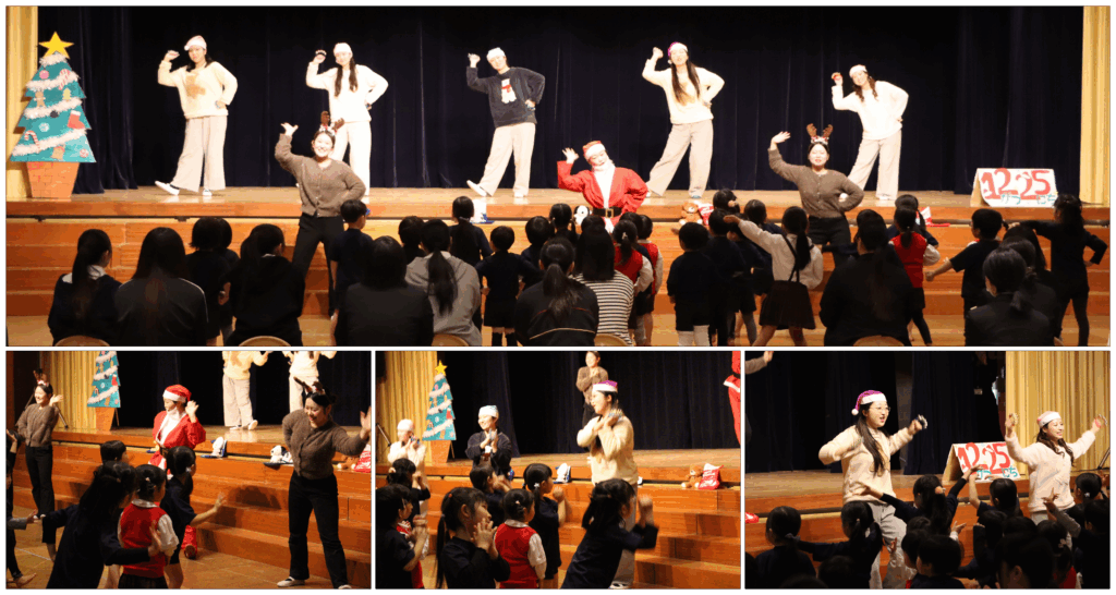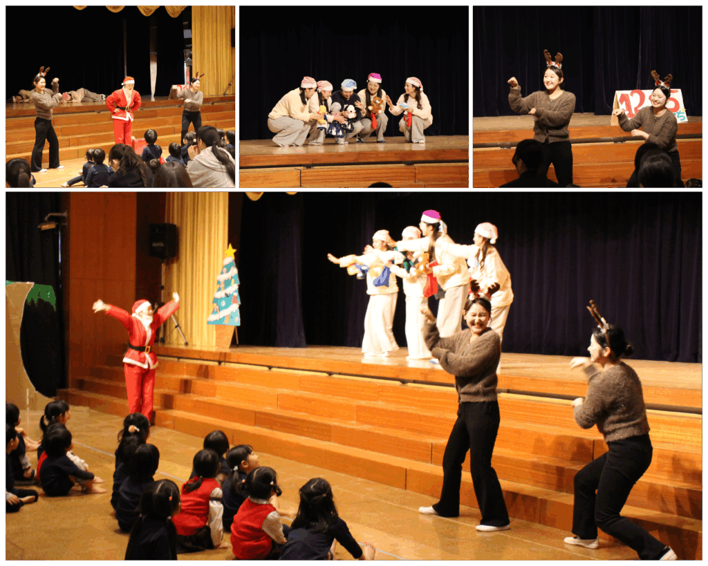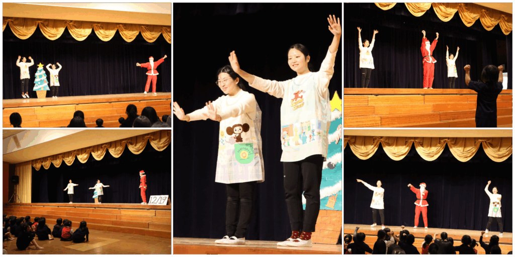 続いて、何日か経ち、クリスマスになると・・・サンタクロースがトナカイを連れて再びやって来ました。今度は子どもたちにプレゼントを配ると、子どもたちは大喜び!「ジングルベル」をみんなで踊ることに!ジングルベルのダンスは、グループのメンバーで創作したオリジナルです。