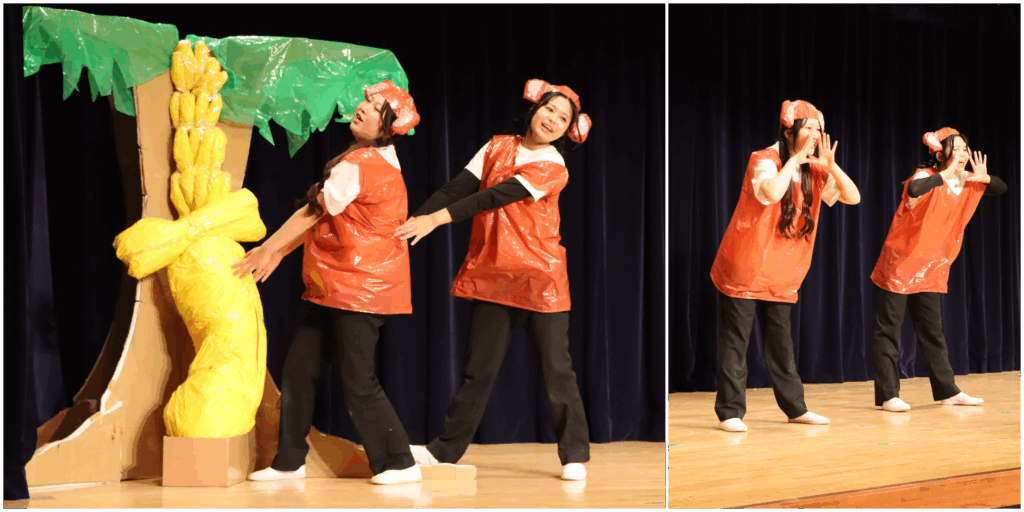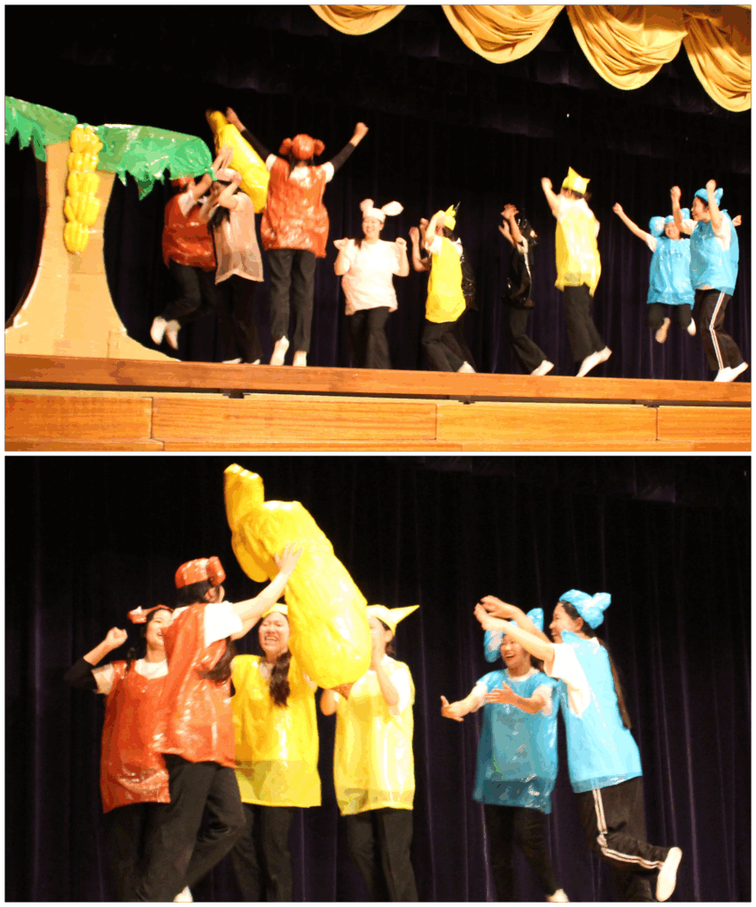 続いて、”おおきなかぶ”ならぬ「大きなバナナ」です。おさるさんたちが、バナナの木になっているバナナに「おおきくなぁ~れ!おおきくなぁ~れ!」と願いをかけると・・・とても大きなバナナになりました。
