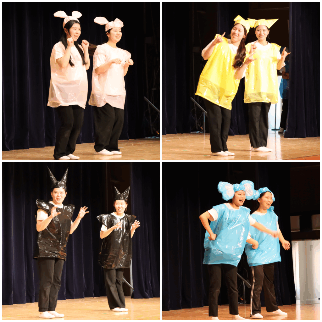 そして、「人形劇」「折り紙」「表現あそび」の上演がすべて終わりました。それぞれの発表の中で、子どもたちに問いかけたり、一緒に踊るよう誘ったりと工夫することで、子どもたちも楽しく参加でき、笑顔が広がりました。子どもたちの心とホイクカ女子の心がつながったように感じました。