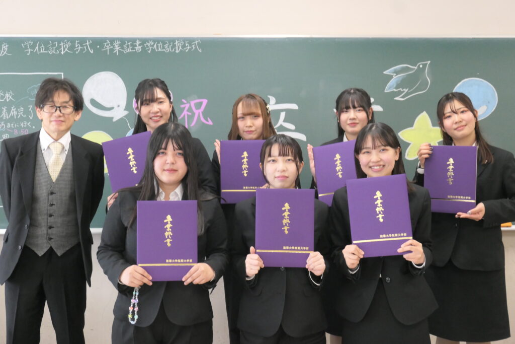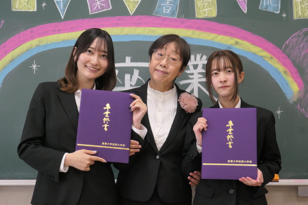 式典を終え、卒業証書を手に晴れ晴れとした学生の皆さんです!卒業生の皆さんはセイトクでたくさんのことを学びました。楽しいことだけではなく、苦しくて悩んだこともあったことでしょう。でも、今、手にした卒業証書はそんな時間が大切な自分の時間だったことを証明してくれるものです。この学びを糧に、4月から現場で活かす時が来ました。未来を担う子どもたちに愛情を一杯注いで、ステキな保育者になってください!!