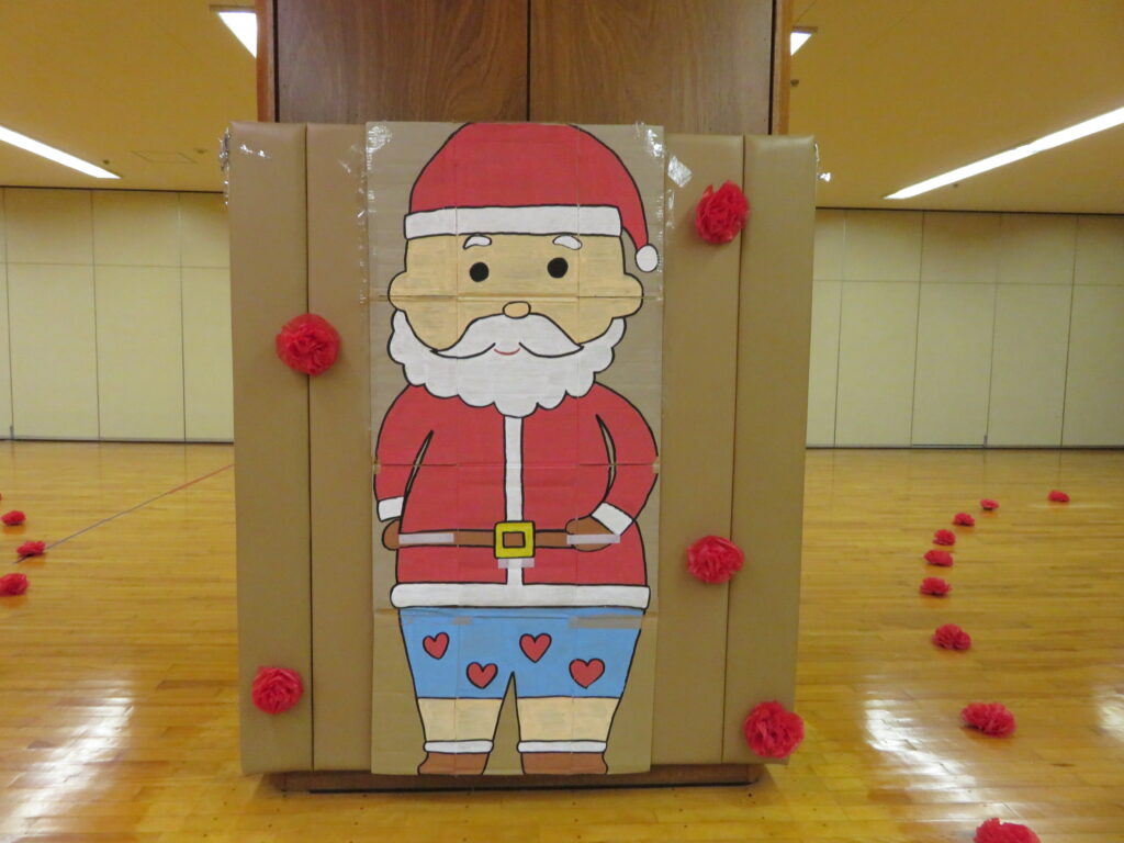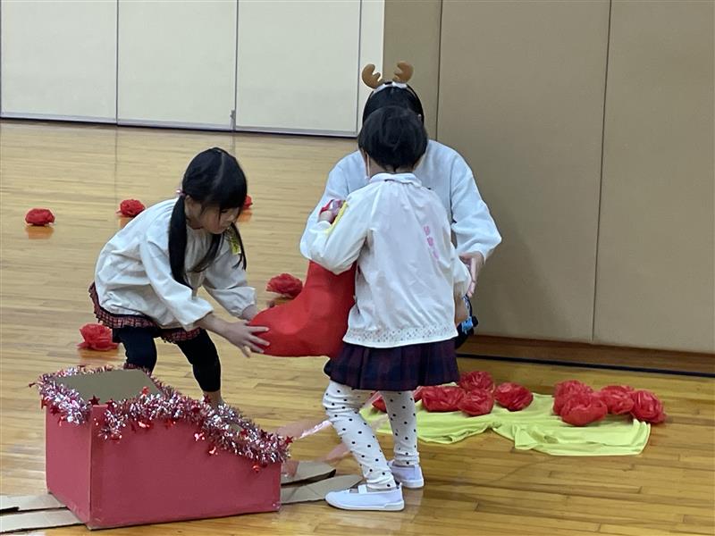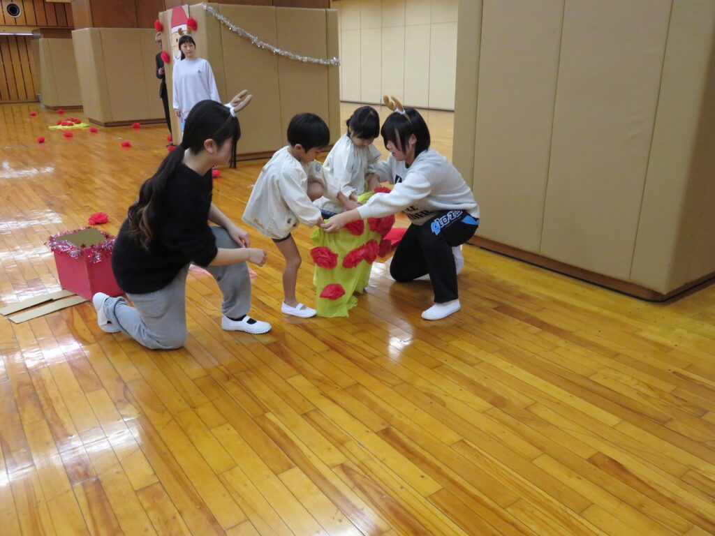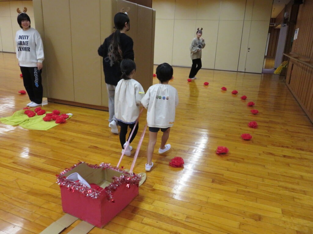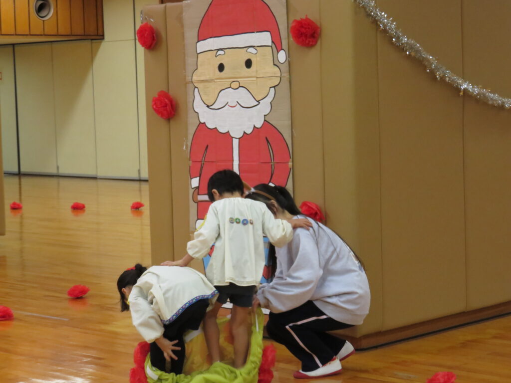 完成!!サンタさんの大きなズボンを見つけやっとはかせることができました。みんな、ありがとう!これでサンタさんはみんなの所に素敵なプレゼントを届けることができるよ!!競争ということもあり、焦ったり雑になったりすることもありましたが、二人で声を掛け合ったり応援してくれるみんなの声援もあり、二人の動きは息ぴったりでした!勝敗よりも協力して完成させることができたことに満足感を感じていたようです。