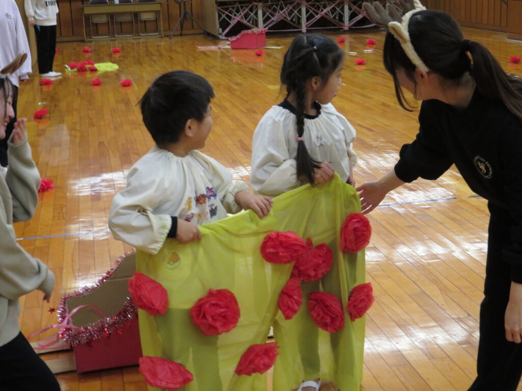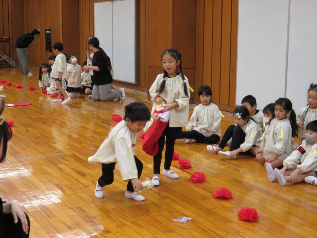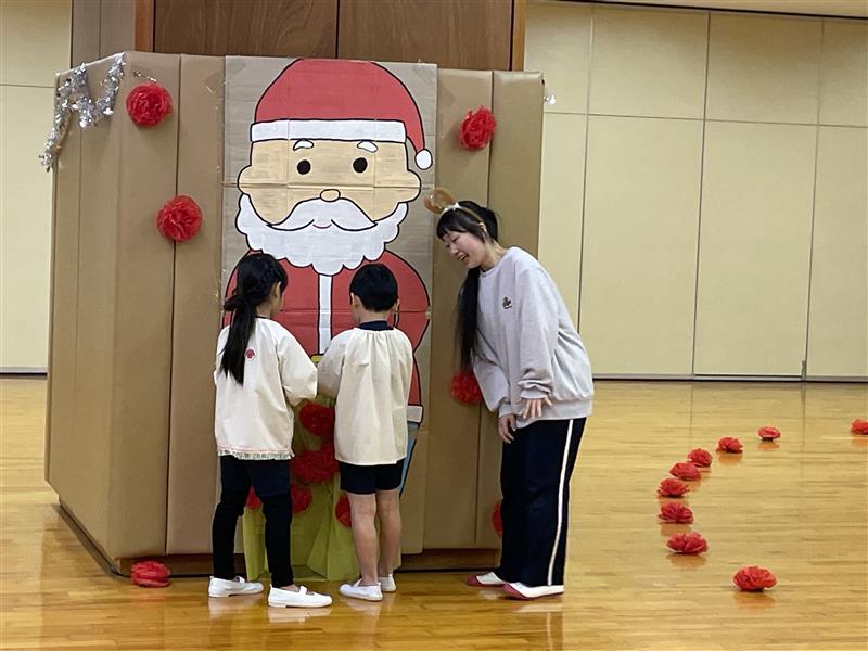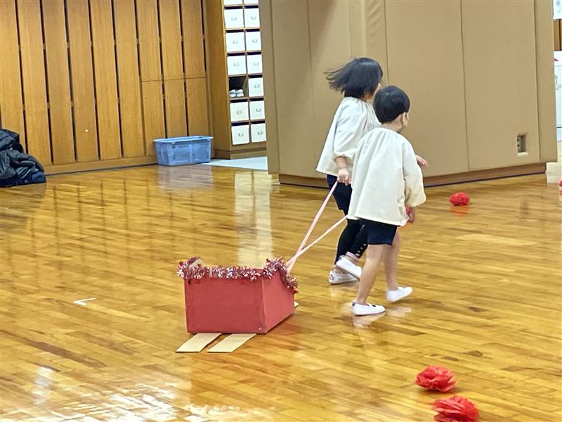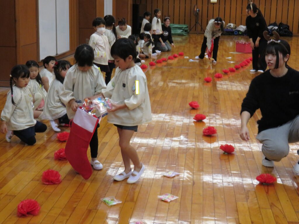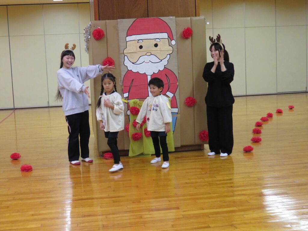 完成!!サンタさんの大きなズボンを見つけやっとはかせることができました。みんな、ありがとう!これでサンタさんはみんなの所に素敵なプレゼントを届けることができるよ!!競争ということもあり、焦ったり雑になったりすることもありましたが、二人で声を掛け合ったり応援してくれるみんなの声援もあり、二人の動きは息ぴったりでした!勝敗よりも協力して完成させることができたことに満足感を感じていたようです。