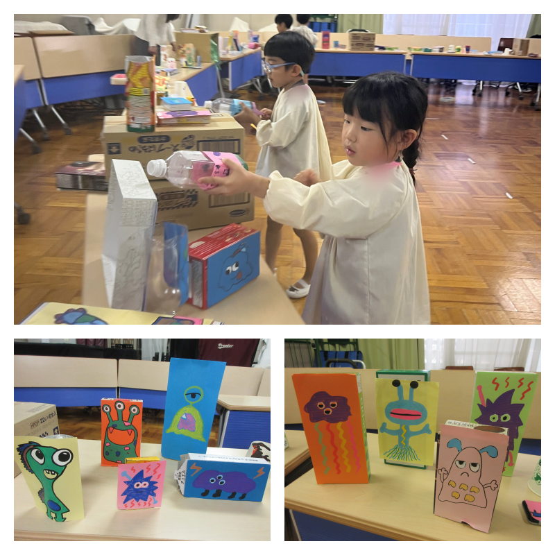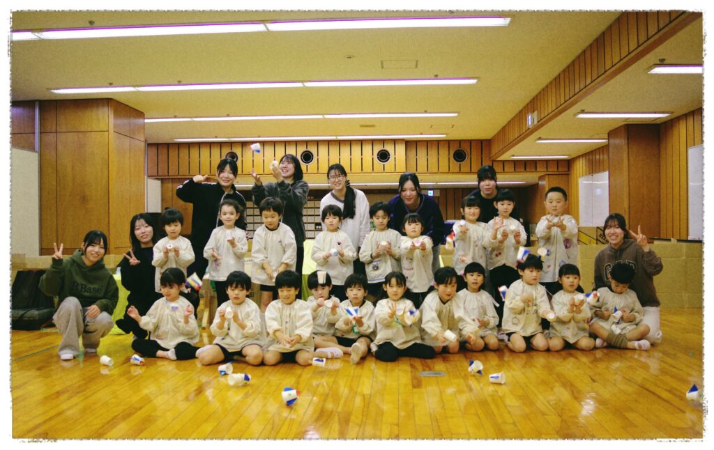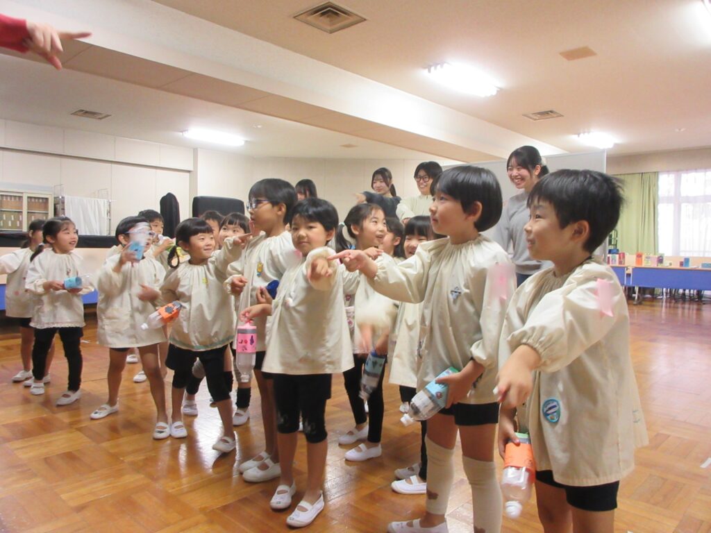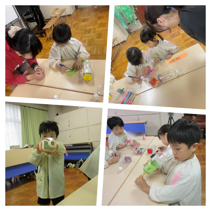 子どもたちが製作しているのは空気砲です!自分で気に入った絵を描いて、世界で一つの特別な空気砲を作っています。どんどん気に入った絵をかく子ども、お友達がどんな絵を描いているのか見ている子ども、空気砲の仕組みに興味をもつ子ども、色々な姿がありました。いったいこの空気砲で何をするのでしょうか?