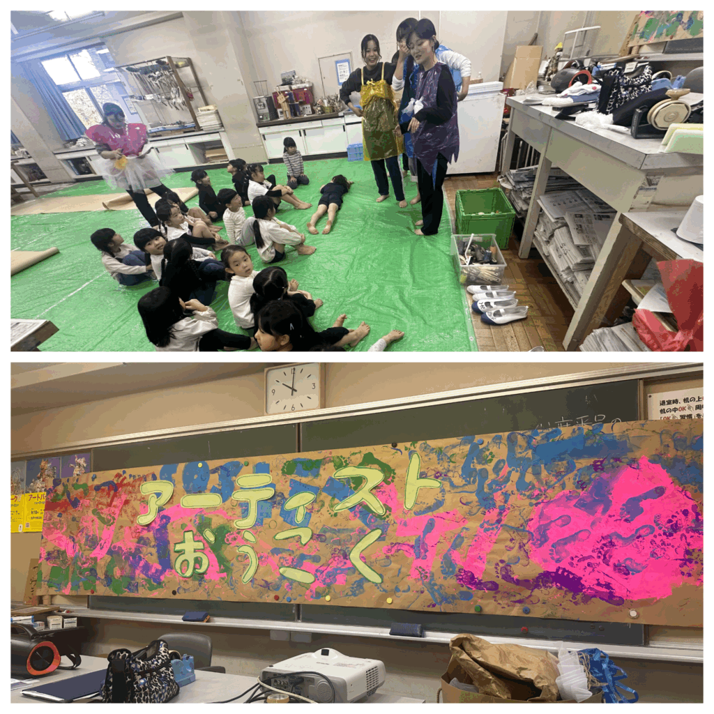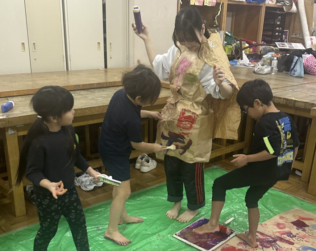 私たちは、子どもたちが普段経験できないような全身を使って思いきり表現を楽しむ体験を行いたいと考え、90㎝×8mの紙2枚を使って行う絵の具あそびを考えました。全身を使って表現する体験を通して、子どもたちが絵の具に親しみ、新たな表現に挑戦して楽しめるような「お~きいかみにえをえがこう~これでみんなもアーティスト~」のワークショップを企画しました。