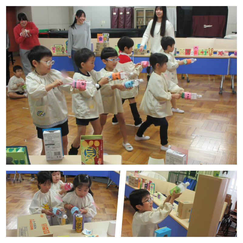 子どもたちは、すっかりハンターになりきっています。ねらいを定めて空気砲をうまくつかって次々にモンスターを倒していきます。どうやったら空気砲の勢いがよくなるのか工夫したり、遊びに夢中になったりする子どもの姿をみて、こちらもワクワク楽しくなりました!!
