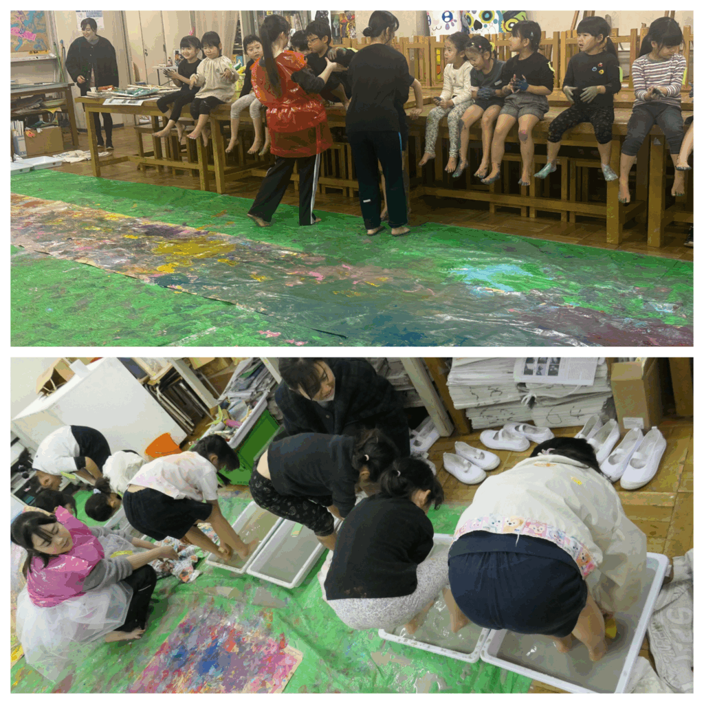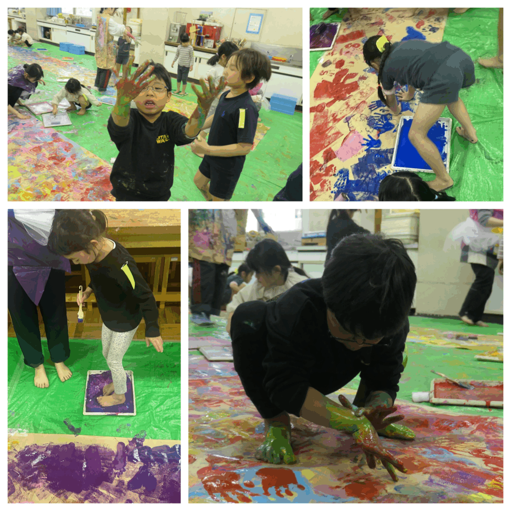 活動が進むと、活動がどんどん活発になり、足に絵の具をつけて音楽に合わせて走ったり、手や足につけて、よつんばいになって歩いたりして表現を楽しんでいました。活動の始めは絵の具が手につくことを躊躇していた子どもも次第に慣れ、絵の具の温度やぬるぬるとした絵の具の感触を手足で直接感じて味わっていました。また、5歳児にもなると混色の知識があり、絵の具にない色は、自分でつくって遊ぶ姿も見られました。