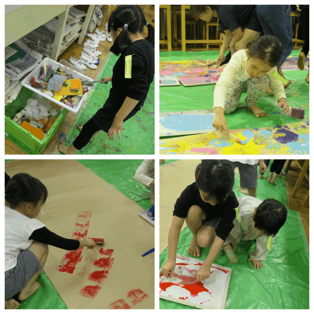 道具は、どれにしようかな?ローラー、スポンジ、プチプチ、、、、子どもたちが選んで描き始めます。