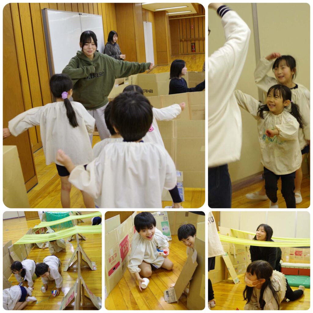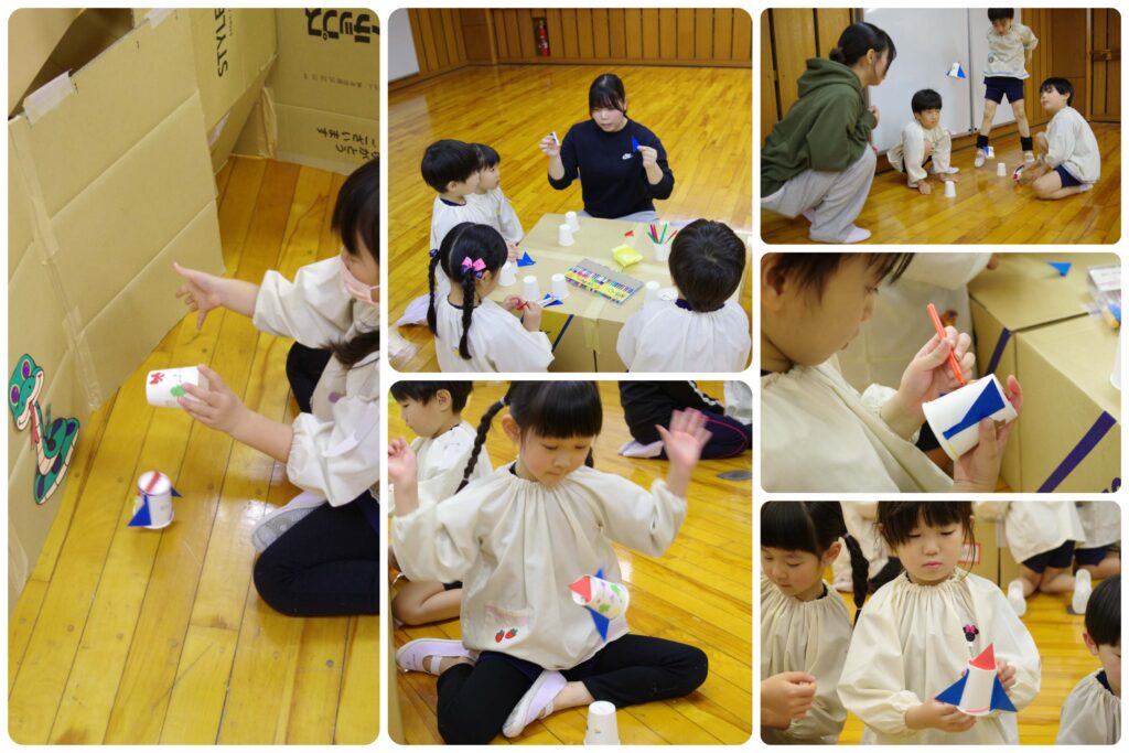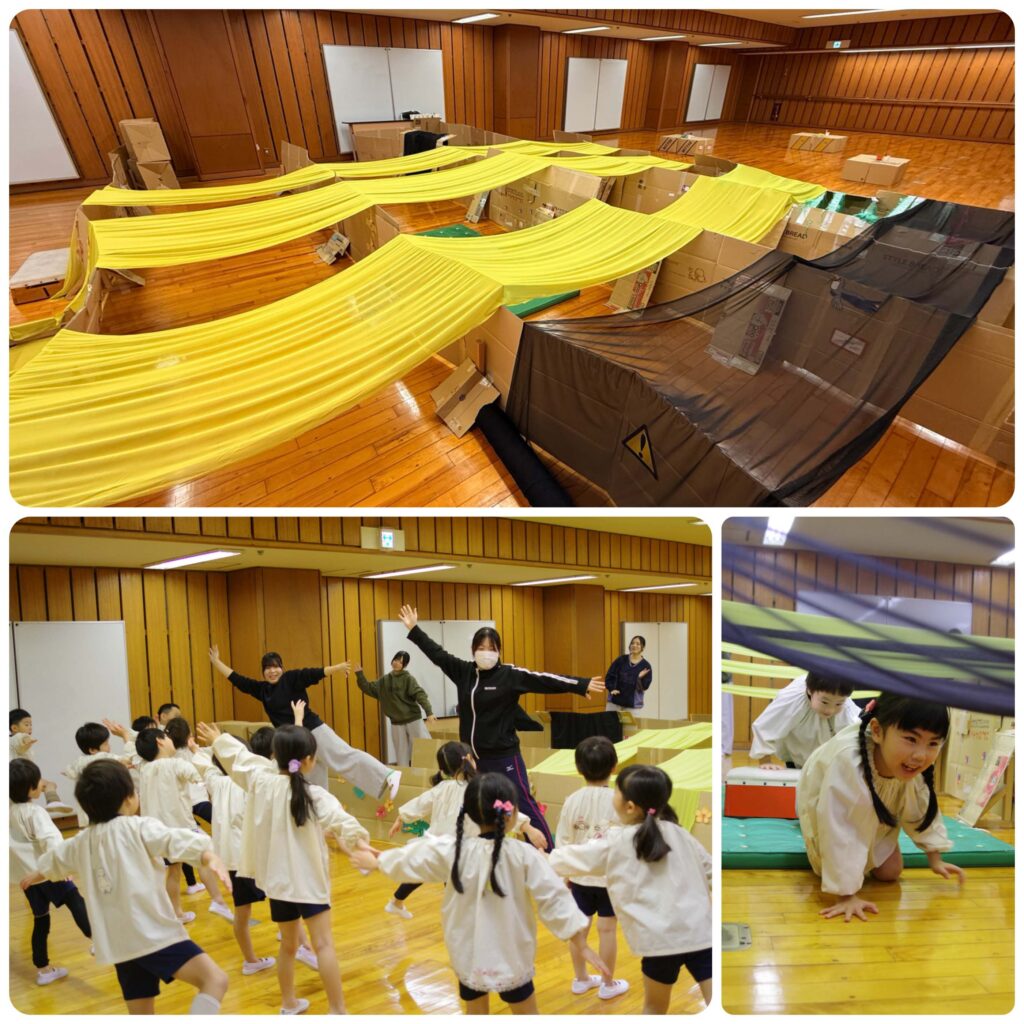 迷路を立てるのに苦労したこともあり、割とシンプルで短い迷路なのであっという間に終わり飽きてしまうかとおもいきや、四つん這いで進むという仕組みが探検感を増したのか、もう一度やりたい!!と何度も何度も繰り返す無限ループが起こりました!!あえて行き止まりに行ってみたり、作った紙コップロケットで通路を飛び越さないと潜れないという独自ルールを作っては、またまた繰り返す。楽しいことは何度もやりたいという子どもの気持ちを見事に刺激した活動となりました!