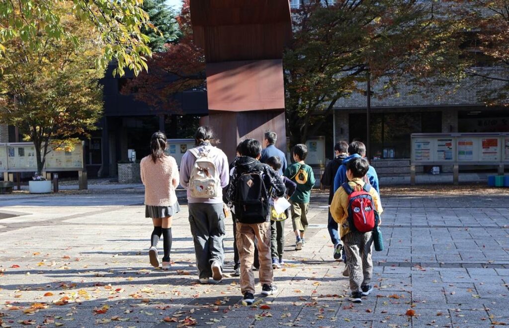 上の写真は、子どもたちがクリスタルホールでの開講式を終えて、実施会場の1号館へ向かっている様子です。