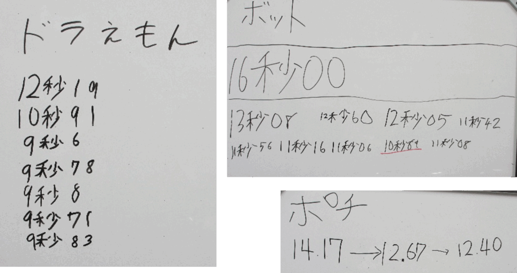 一番最初の時間がはじめてゴールできたときの時間、最後の時間が一番縮められた時間を書いてもらいました。