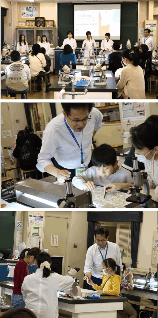 親子で力を合わせて個体を探すほほえましい姿、補助の学生の助けを借りて大きな顕微鏡をのぞき、「うわー、大きいぞ」「葉っぱの中の粒が動いてるよ」など驚きの声を上げる笑顔がたくさん見られました。