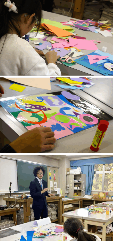 『<図画工作>ふしぎな形!?みつけたよ!』では、リサイクルボックスに集まった、色とりどりの紙の切れはしから「ふしぎな形」を発見し、切ったりはったり試行錯誤しながら、思いがけない形や色の組み合わせを楽しみました。