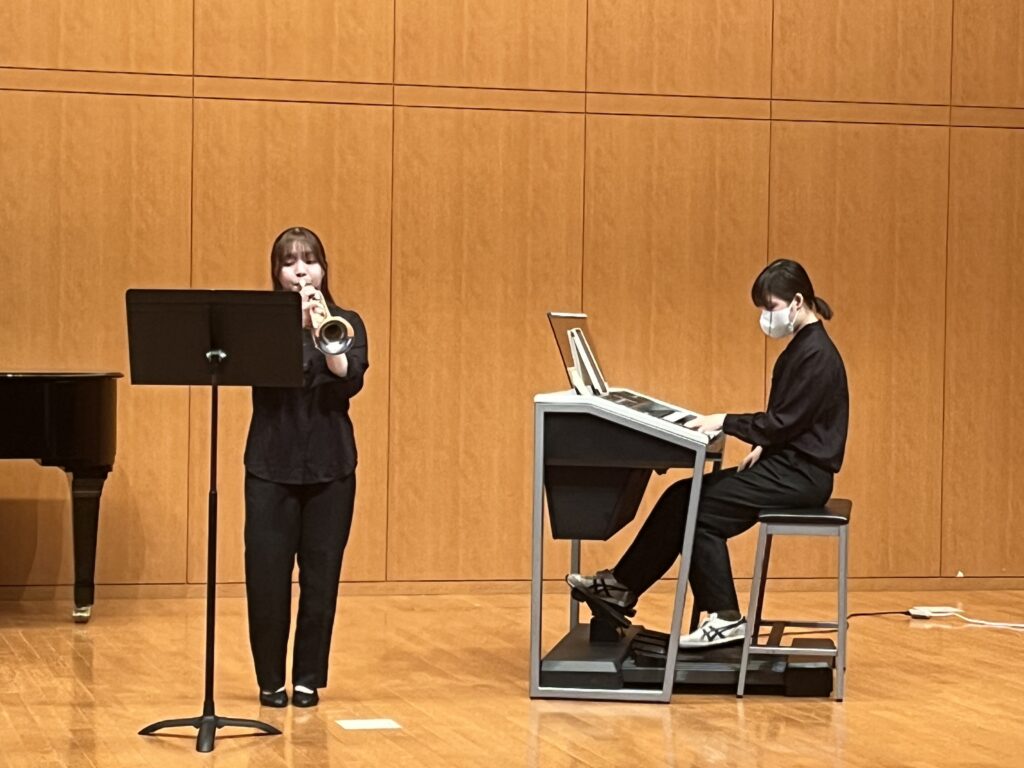 電子オルガンの学生は自分自身で編曲を行いました。1人で色んな音色を出せる電子オルガンが管楽器とアンサンブルを行うことは珍しいのですが、ジャズバンドを電子オルガンで再現し、そこにソロのトランペットを際立たせる良い編曲でした。